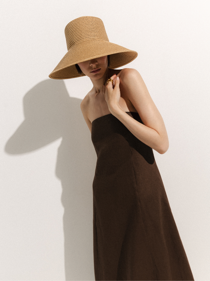 Linen open shoulder chocolate skirt. With hidden pockets and an elastic band on the back.