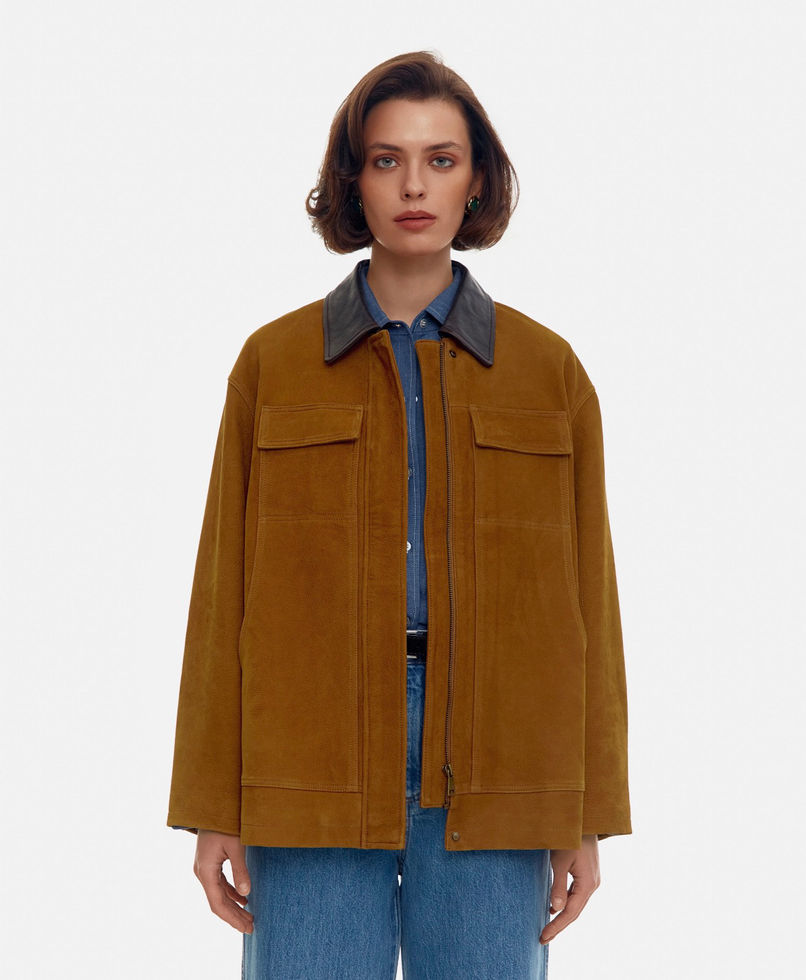 Фактурна куртка з натуральної шкіри ягняти гірчичного кольору. Має акцентний вінтажний шкіряний комір.